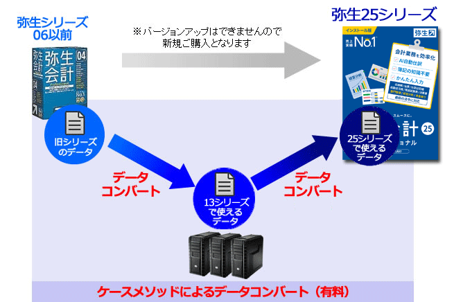 06以前の弥生シリーズをお使いの方は新製品へのバージョンアップはできませんので、新規に弥生シリーズをご購入して頂くことになります。この場合、以前お使いの旧シリーズの弥生のデータ移行はできません。最新の弥生シリーズにセットされているデータコンバーター(コンバートキット)は、13以降のシリーズにしか対応していないからです。よって、旧シリーズの弥生のデータを最新のシリーズでも使いたい場合は、弥生の認定ビジネスパートナー会社による有償でのデータコンバートが必要となってきます。